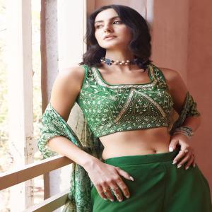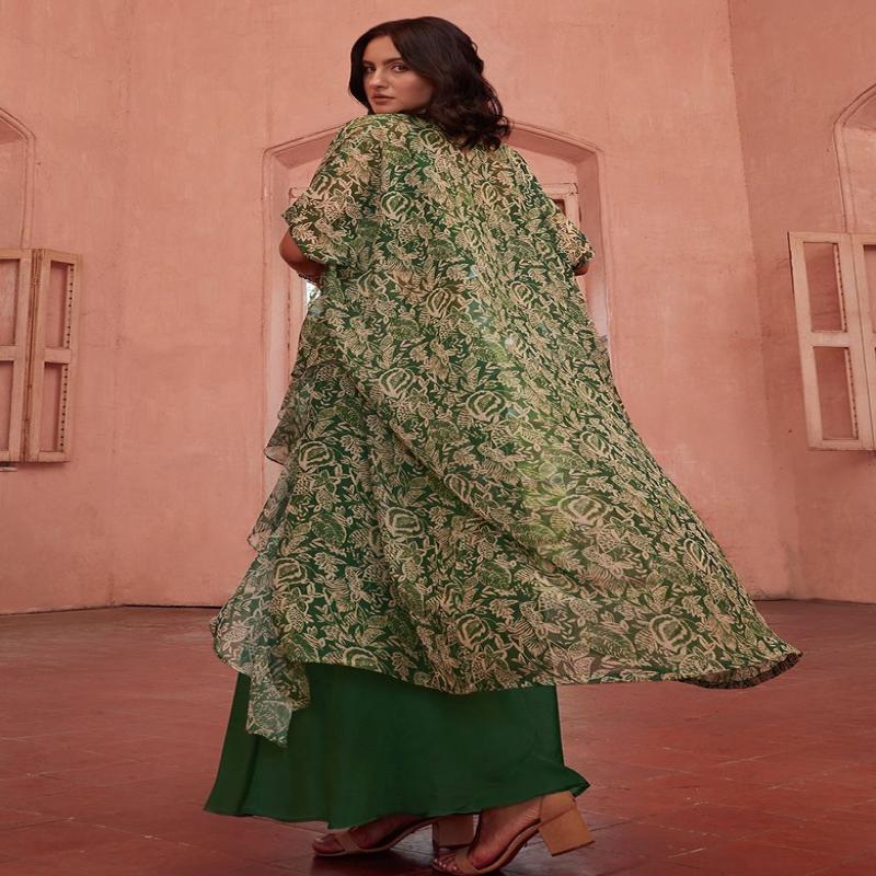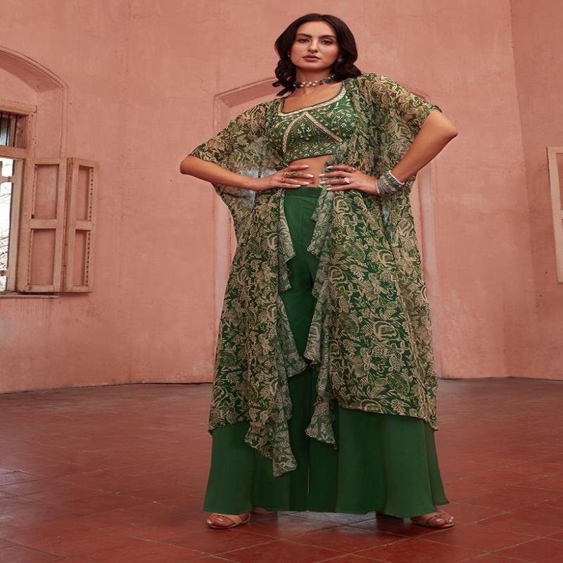Green Thread Mirror Embellished Georgette Sharara Set - XKS03197