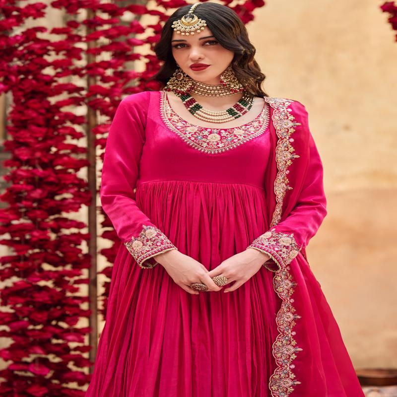 Our Hot Pink Embroidered Satin Anarkali includes a satin top with santoon inner, santoon bottom, and an organza dupatta. Embroidery is present on this style using zari, sequins, and hand work.
