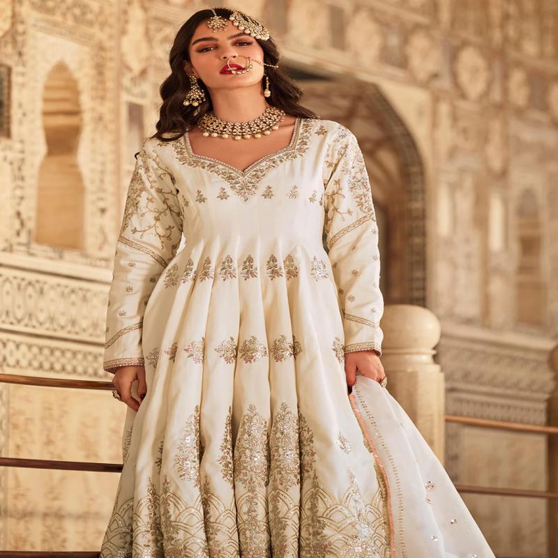 Our Ivory Embroidered Silk Anarkali includes a silk top with santoon inner, santoon bottom, and an organza dupatta. Embroidery is present on this style using zari, sequins, and hand work.