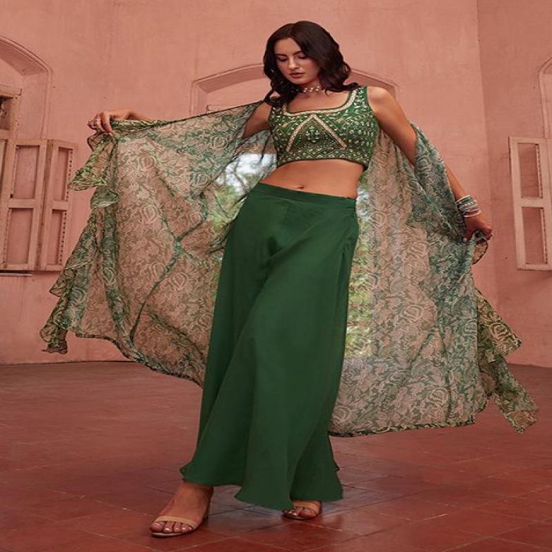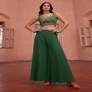 Green Thread Mirror Embellished Georgette Sharara Set - XKS03197