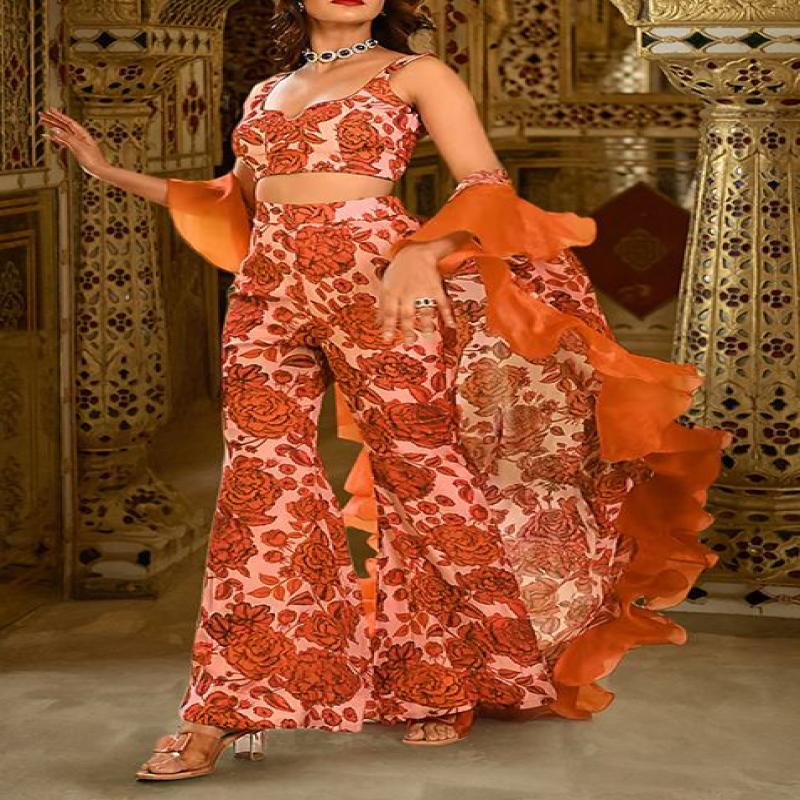 Orange Jacket Set With Printed Blouse And Pants - DFS00193