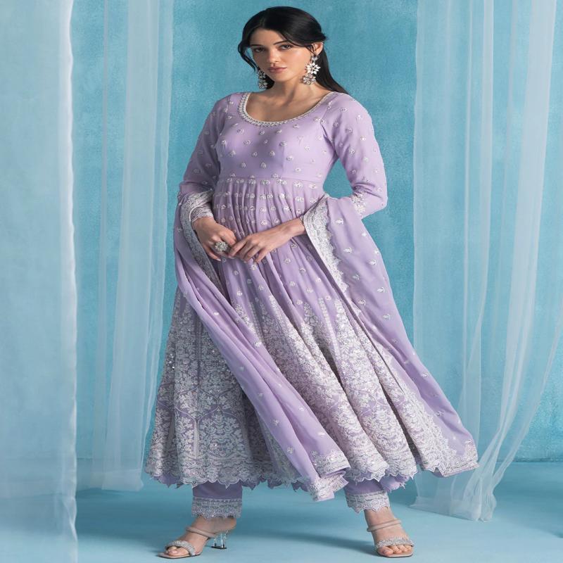 Our Soft Purple Embroidered Lucknowi Anarkali includes a georgette top with santoon inner, georgette bottom, and a georgette dupatta. Embroidery is present on this style using thread, sequins, and stone work.